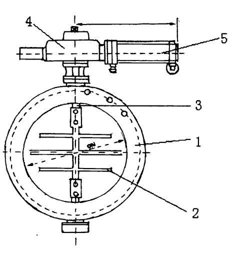 針對上述提到的塵氣碟閥的缺點,本文提供一種新型的塵氣蝶閥。為了實現(xiàn)上述目的,本實用新型所采取的措施氣動式斜板塵氣蝶閥,包括閥體和閥桿,所述的閥體內(nèi)設(shè)有采用傾斜方式關(guān)閉的碟板,碟板與閥桿相連。所述的閥體上設(shè)有機械裝置和通過機械裝置對碟板執(zhí)行啟閉的氣動裝置。本實用新型的有益效果閥門啟閉阻力減小,自動化程度大大提高,利于推廣應(yīng)用。